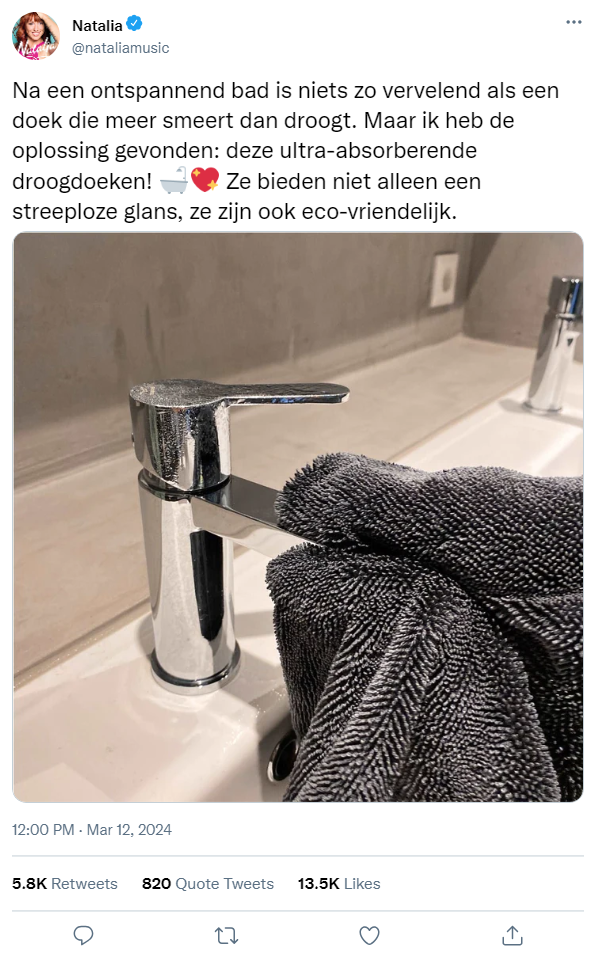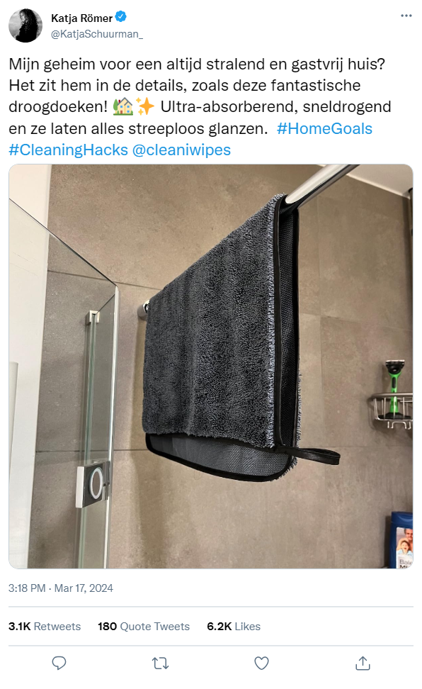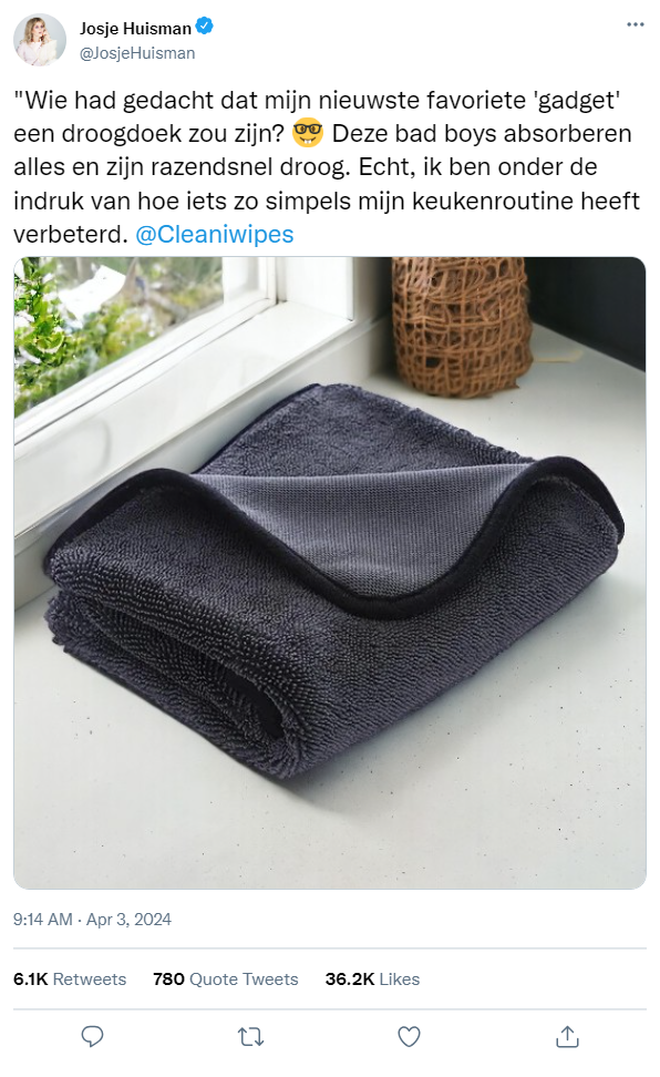 Onze doek is gemaakt van kleine zachte microvezel draadjes, deze draadjes nemen tot 800ml water op en zorgen ervoor dat de hele douche streeploos droogt. Andere microvezel doeken hebben deze draadjes niet en nemen daarom minder water op + drogen niet streeploos.